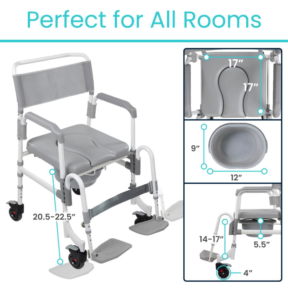 Experience unparalleled versatility with the Shower Commode Transport Chair. This product combines the functionality of a shower chair, commode, and transport chair into one compact solution. With sturdy locking wheels, this chair provides smooth transportation across various surfaces and locks securely in place to prevent unwanted movement, offering stability and peace of mind. - Durable And Lightweight Aluminum Design
