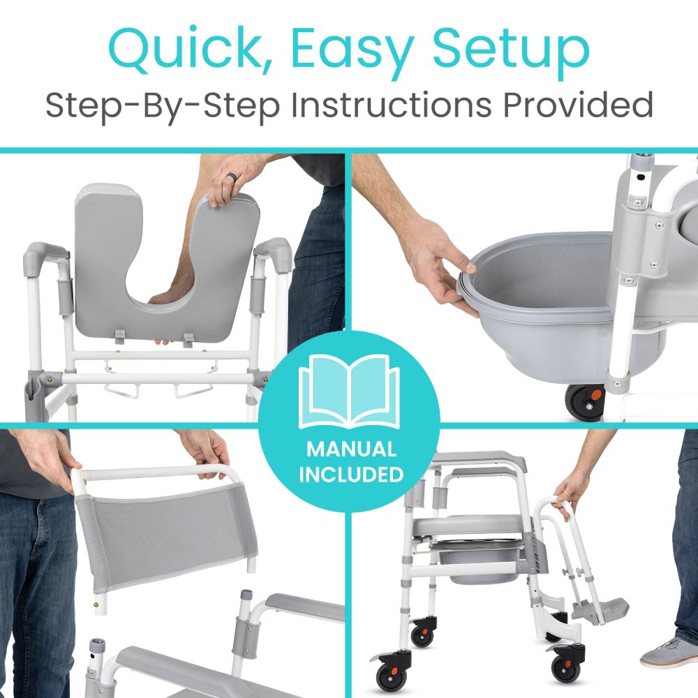 Discover the Shower Commode Transport Chair, an innovative 3-in-1 solution to streamline your caregiving needs. This versatile chair integrates the functionalities of a shower chair, commode, and transport chair into a single, efficient unit, maximizing both space and utility. Its sturdy locking wheels ensure safe and smooth transportation across various floor types, securely locking in place to provide a stable experience during use. Constructed from high-quality, lightweight aluminum, the chair is easy to maneuver and robust enough for frequent use, boasting rust resistance that makes it perfect for wet environments. Comfort is paramount with its thick, wide cushioned seat and adjustable footrests that accommodate most body types for optimal support and ease.