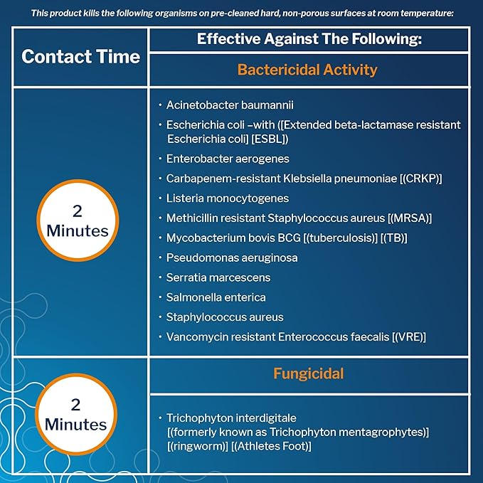 - This product kills the following bacteria in 2 minutes on pre-cleaned hard, non-porous surfaces at room temperature when used as directed: Acinetobacter baumannii, Escherichia coli – with ESBL (E. coli), Enterobacter aerogenes, Carbapenem-resistant Klebsiella pneumoniae (CRKP), Listeria monocytogenes, Methicillin-Resistant Staphylococcus aureus (MRSA), Mycobacterium bovis BCG (tuberculosis) (TB), Pseudomonas aeruginosa, Serratia marcescens, Salmonella enterica, Staphylococcus aureus, Vancomycin-Resistant Enterococcus faecalis (VRE).