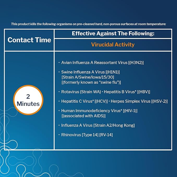 - (H1N1), Rotavirus, Hepatitis B Virus* (HBV), Hepatitis C Virus* (HCV), Herpes Simplex Virus (HSV-2), Human Immunodeficiency Virus* (HIV-1) (associated with AIDS), Influenza A Virus Strain A2/Hong Kong, Rhinovirus. This product kills the following fungi in 2 minutes on pre-cleaned hard, non-porous surfaces at room temperature when used as directed: Trichophyton interdigitale (Ringworm).
